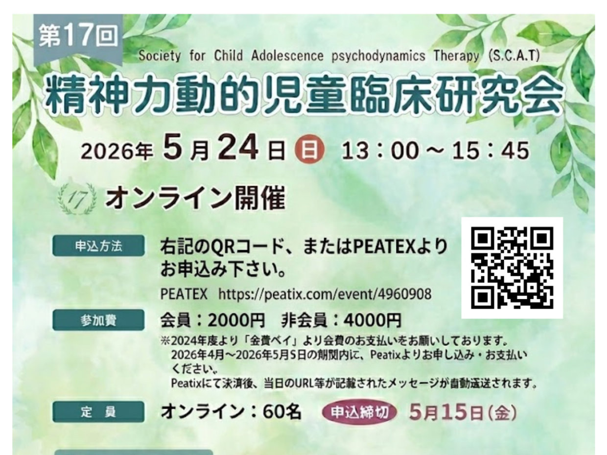 SCAT トップページ 2019.08.082026.04.14 SCAT 児童分析臨床研究会 子どもの精神療法の基礎が学べます年4回の研修会で、子どもと親の心に対する理解の仕方と治療が理解できます。 入会案内 会員専用ページ 研究会開催案内 第17回 精神力動的児童臨床研究会2026年5月24日(日)開催 詳細はこちら 事前動画視聴用ページ お問い合わせ 必須お名前 必須メールアドレス 必須件名 必須お問い合わせ内容 もし、問い合わせフォームで送信できない場合、こちらに連絡してくださいstudygroup_2008@yahoo.co.jp
